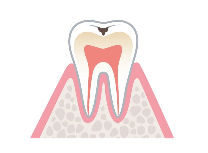 むし歯がエナメル質に達すると表面に小さな穴ができます。感染部分を取り除き、詰め物などで修復が必要です。放置すると進行しやすく、痛みが出る前の対応が大切です。