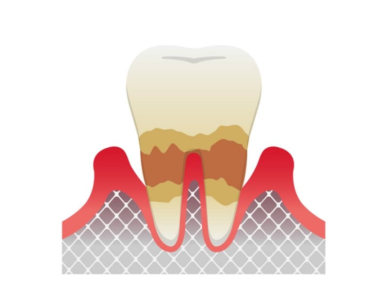 中等度の歯周炎では歯周ポケットが深くなることで、歯を支える骨が減り、歯のぐらつきや口臭がみられます。治療は歯の根をきれいにするルートプレーニングが基本ですが、場合により外科処置も必要です。