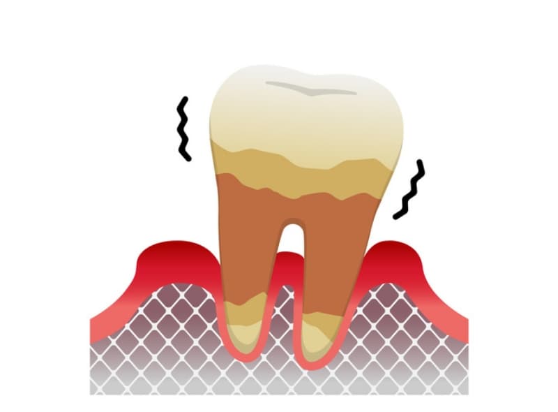 重度の歯周炎では歯を支える骨がほとんど失われ、歯がぐらつき膿が出ることもあります。歯を残すのは難しく、抜歯が必要となります。抜歯後はインプラントや入れ歯で噛む機能を回復します。